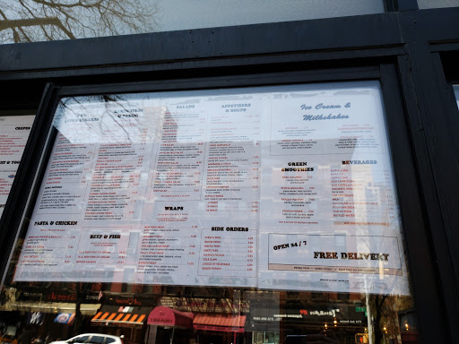 Extra large menu... with a wide range from greasy spoon to healthy spoon, its sure to please everyone. With lots of seating and large windows at the street, the ambiance is just right. On my visit, I thought the food and service was great. No complaints from me at all.
