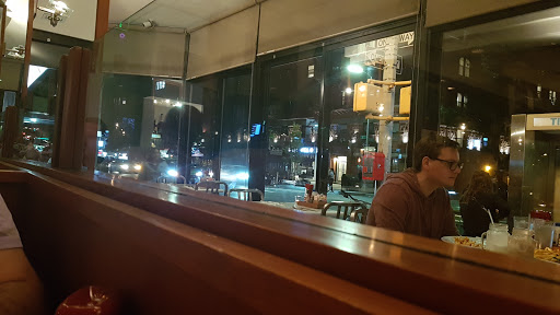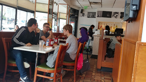 Ive read a few reviews that complained about service, but that has not been my experience at all. I used to live right next door and now I live a few blocks away. Ive eaten there at 3am, 1pm and 6pm - the service is always great! After a few visits, the staff will start to recognize you. Though I have once or twice had misunderstandings about my order (Im a very picky eater) the staff was always quick to do whatever they could to make my visit enjoyable. The place is often cold and I once moved three times to find a warmer spot and the waiter came and helped me all three times, even reccomended a warmer spot. The food is delicious. I only get the open-faced chicken souvlaki, but friends Ive brought with me say the burgers are really good amongst other things. The staff is very friendly and involved with itself and often sit around the counter watching whatever game is on and chatting when not busy. This doesnt bother me at all - they are always quick to refill drinks and bring me my food. All in all - I love this place. I dont eat out often, but when I do I go here and I always bring my friends. I typically curl up in a booth (or by the window - the walls are all windows and offer a nice view of the streets) and read a book while I enjoy my food.