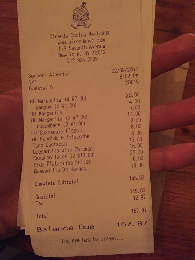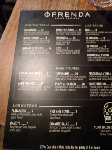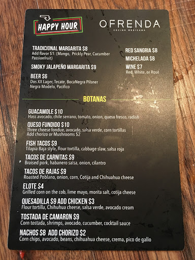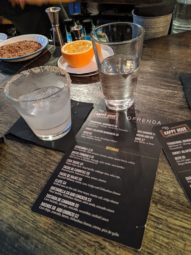 What really impressed me here is their amazing happy hour. But thats only half of it. The bar was full so we had to make our own space at one of the service areas/entry to the bar. The bartender (igor) the barback and the manager were all very cordial and professional even though we were technically blocking their space and the value of the happy hour is really great. Incredible fish tacos and margaritas :) Igor the bartender is friendly yet professional and I will definitely be back. Thanks Ofrenda!