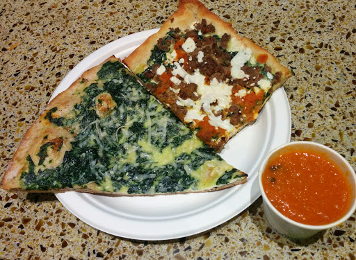 This place. I think I could eat here all day or for each meal. However you want to swing it. They have breakfast pizza which was so surprising good Im still thinking about. Lol. I got the BLT pizza which has bacon, leeks, tomatoes, cheese, and eggs. Damn good. Inside the restaurant they have flavored oils: garlic oil and jalapeño oil. Im a fan of the garlic oil. They even have a habañero sauce which is tasty but soo hot. All of the pizza I have tried is damn good. I love the pomodoro slice. The Lafayette with sauteed onions and cheese was good. The broken lasagna mmmmm good. They have 2/$6 on the slices after 7pm. Their sauce (tomato) is so tasty I used it for the holidays this year as a dip for family. They sell it separately. Thank you. They have rice balls (with beef inside) and fried spaghetti which is a bit like a baked spaghetti (alt to baked ziti) ricotta cheese, fried in a ball and served with their yummy sauce. Sometimes the pizza can bit a weeee bit dry so I just get the sauce or oil on the side. Sall good. Their baked goods are equally tasty and flavorful. Love the brownies. They have a cannolo cupcake. They have complimentary alkaline water with fruit and cucumber for dine in. Check them out.