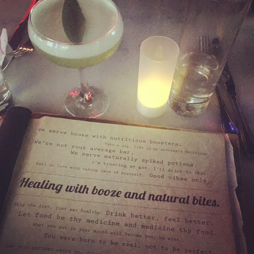 This bar is wonderful. Although its vegan and every food and drink is filled with healthy ingredients, the ambiance is not earthy crunchy at all. Regular dimly lit lounge, bar and a few tables. The drinks are top shelf and they even have gluten free vodka. The staff are friendly and seem to enjoy talking about the concept and the food. Gotta go !
