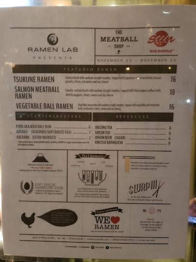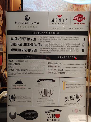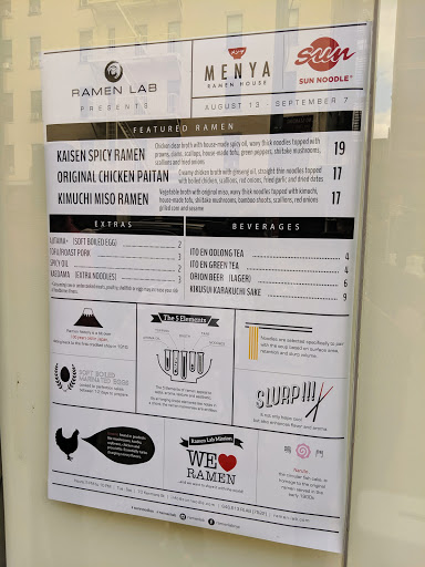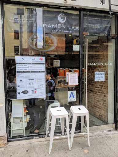 Ramen Lab is Sun Noodles test kitchen. Every month, a different guest chef occupies the space to try their hand at the NYC ramen scene. The chefs come from all across the US, Japan, and even Europe. In the past, there have been traditional chuka soba ramen-yas, Jiro-kei ramen-yas, iekei ramen-yas, American fusion ramen-yas, vegetarian ramen-yas, and many other unique and creative ramen-yas. While theyre here to see if they can purchase the ingredients they want, provide the same price and flavor in NYC as in their home towns, and confirm other logistical questions, they are primarily testing NYers tastes. So, whether youll actually like the menu when you visit will depend on the guest chef of the month. Pricing also varies, but expect prices to start from $14 and go up to $18 or more depending on how much extra toppings you order. As for the experience, theres only about 12-15 standing counter spaces available. On the one hand, you may have to wait as long as thirty minutes or more, on the other, you get a very intimate and authentic ramen experience. They also have the Okinawa beer, Orion, regardless of the chef of the month. I try to go every month because its always fun to try the restaurants, which are trying to decide whether to come to NYC or not, and to talk to the chefs!