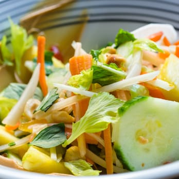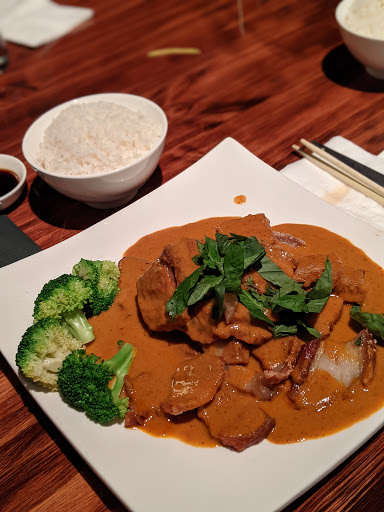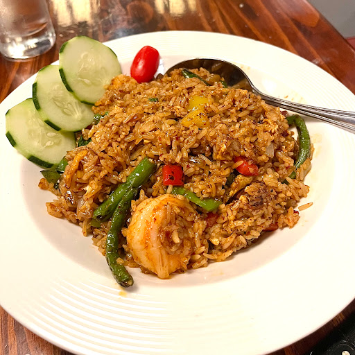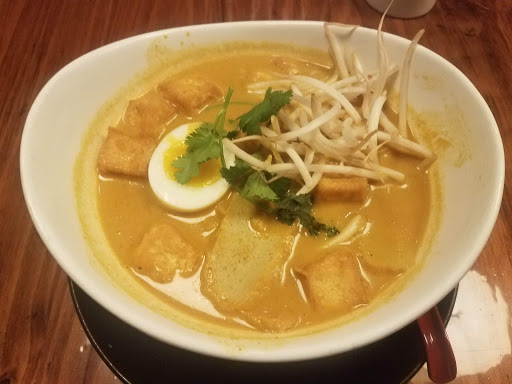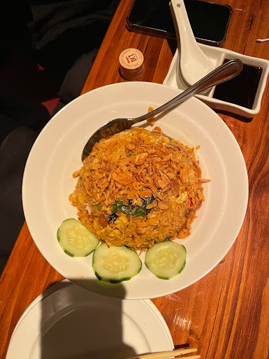 The seating was nice and the food was pretty delicious. First off, the kani salad was amazing. I personally love kani salad, so I may be biased here, but it was really good that I couldnt stop eating it. I also had the tom yam soup. I personally dont like sour soups but this was pretty good, aside from the cilantro in it, as I dont like cilantro. Then came the good parts. The curry laksa was so good, like I had to get not even seconds, but fourths and fifths in my bowl. I liked the strong curry flavor that melted in my mouth when I bit into the tofu. I also had the black fried rice. I was astonished because Ive never seen black rice cooked that way. Plus it was really good. I recommend it a lot. It tastes just like regular rice! I personally loved the curry laksa and black fried rice, so I would highly recommend that when you come here.