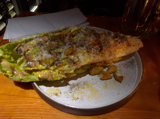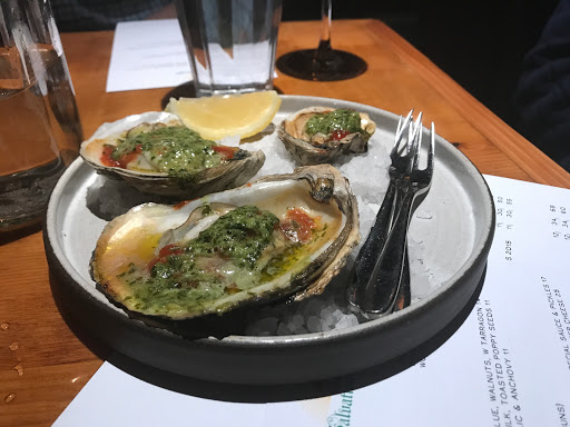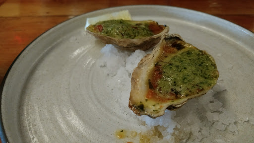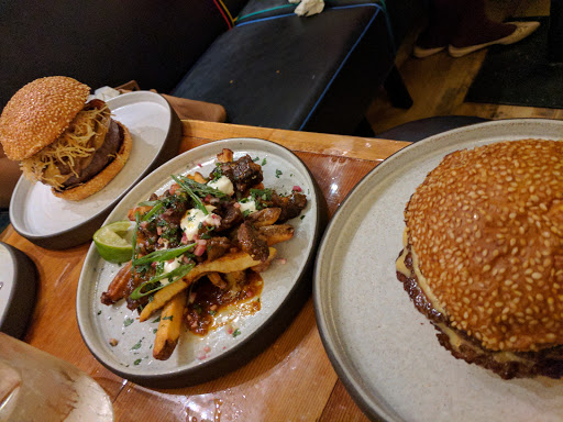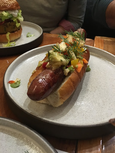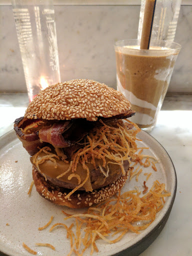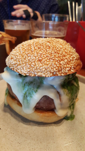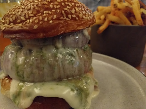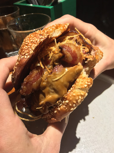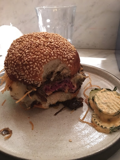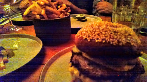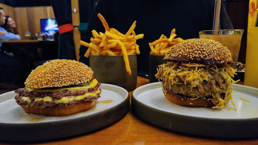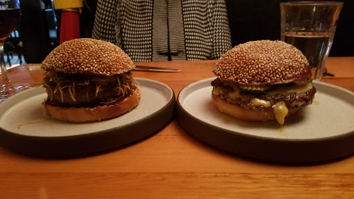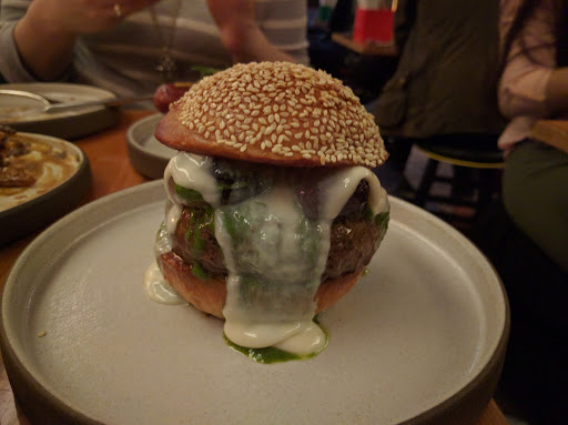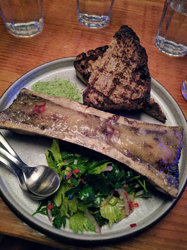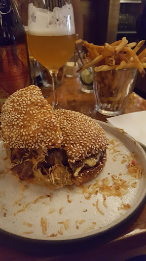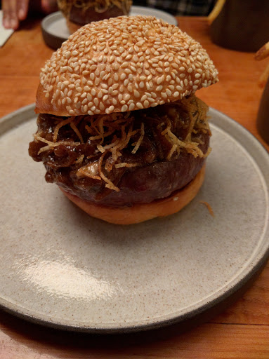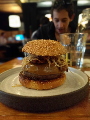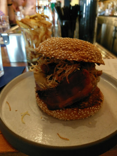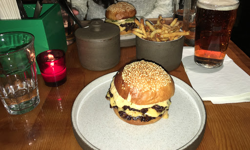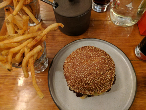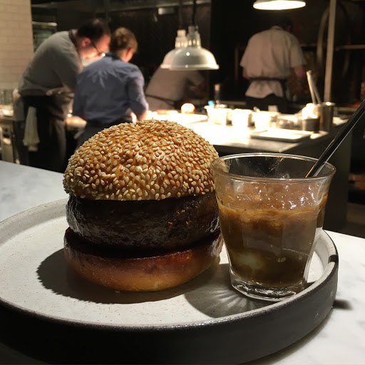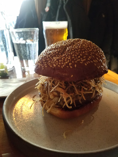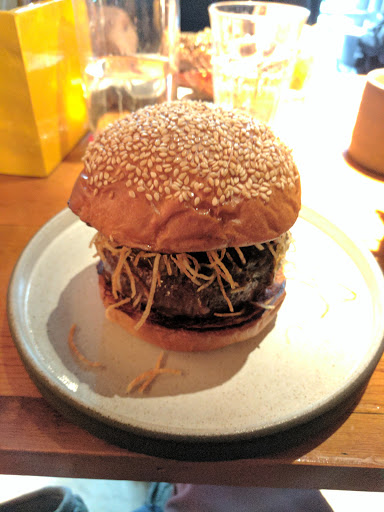 Started with roasted bone marrow. Simple and delicious. Reminded me very (too?) much of the world famous classic roast bone marrow salad at St. Johns in London. Before I finished the dish the burger was already served - not so great, as I had to quickly stuff my face so it wouldnt get cold. Wouldve liked another beer in between, this felt at bit rushed. The Salvation Burger was perfect in many ways; size, sesame bun, meat quality, juicy and cooked perfectly pink throughout. Makes me think it was sous-vide cooked - probably why everything could go so fast. The flavours however were nice but not great, and for a big name (and price) like this, that shouldnt be the experience. Decor of the place pretty standard-hipster; wood panels, metal constructions, your cutlery is in that box on the table and a few craft beers on the menu. High expectations but unfortunately didnt live up to it. Somehow it felt like the "celeb chef" optimised this place with the main goal to quickly make as much money as possible, nothing more.