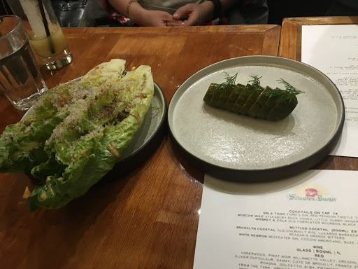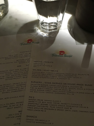 Salvation is reaching unprecedented levels of hype for their burger in Midtown East and with April Bloomfields credentials from Spotted Pig and Breslin, it must be good. The burger is good, but not as life altering as I expected. The classic is a better display of the excellent blend of Pat LaFrieda meat than the Salvation Burger and lets the meat speak for itself a bit more. The blend is delicious and apparently a highly guarded secret. The burger though was quite rare and a bit more raw inside than I typically like, though I can see why it is appreciated. The other items were good too, including the Kirby pickle which has a nice little spice and the hot dog which is more like a bratwurst with some fruit to balance the heaviness. The Caesar salad wedge was awesome with some of the best dressing Ive had. The fries were excellent as well which is a bit of a rarity for good burger places. The desserts may be the best course here. The peanut butter pie is highly recommended and the banana cream pie we had was awesome with glazed "banana glass" on top. The bar is nice as well though pretty small considering there is no where else to wait inside. There are three cocktails on tap, including a nicely spiced Moscow mule. The beer selection isnt huge but is pretty good with several craft beers. The atmosphere inside is quaint with some cool booths with fireplace tv screens that add a little ambiance. The kitchen is also fairly open. The wait here can be astounding though. For dinner there was a 2+ hour wait and even for lunch right after opening on the day before Easter was a 30 minute one. Definitely try to get there right before they open. At least they will text you when ready but there arent many places in the area to wait.