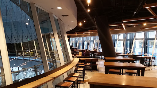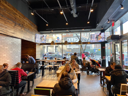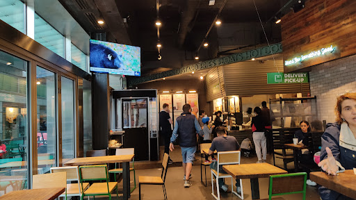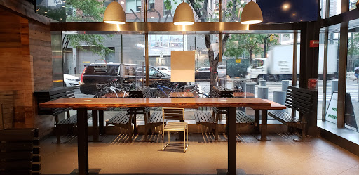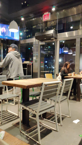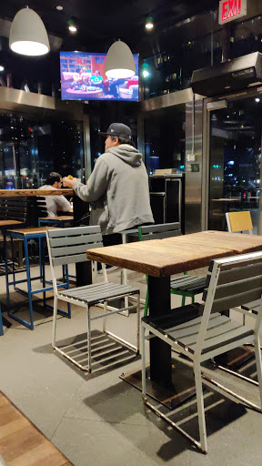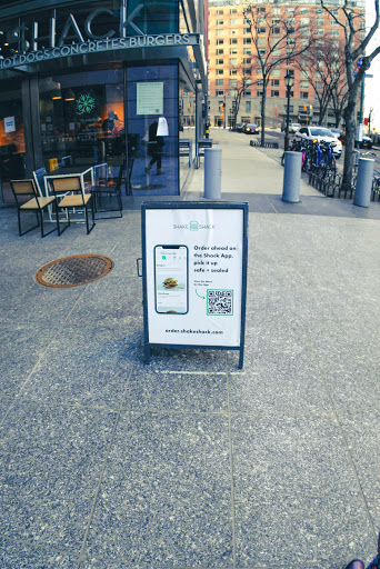 Shake Shack downtown has to expect that lunchtime is going to be the craziest period of the day. This isnt a new store and yet lines at this time can be long and wait times for food verging on the ridiculous. That aside, the burger and hot dog selection is great and the shakes a delight, albeit something you know is bad for you. Service is from behind the counter where you place your order, give your name and wait for it to be called. Seating is at small tables inside and out with a few tall benches and stools and booths in the window. It can be a challenge to get a seat and there are often people holding their trays watching intently for any sign of movement in the booth area. Décor is modern, as befits the newly developed Battery Park City area and there are TVs dotted around the place in case you find your lunch partner boring. So, choose your time carefully and be watchful for that table to come free and youll have a great lunch.