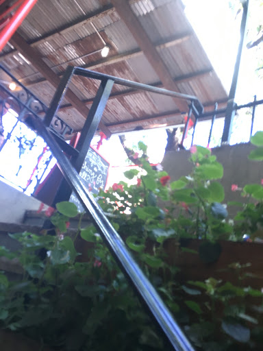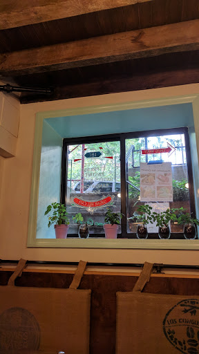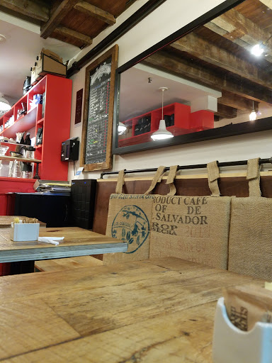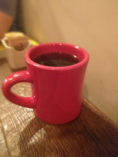 A hole in the ground, almost like a portal into a coffee boat. Pallet furniture and burlap bags with the seats that surround a bright red bar. Very awakening!