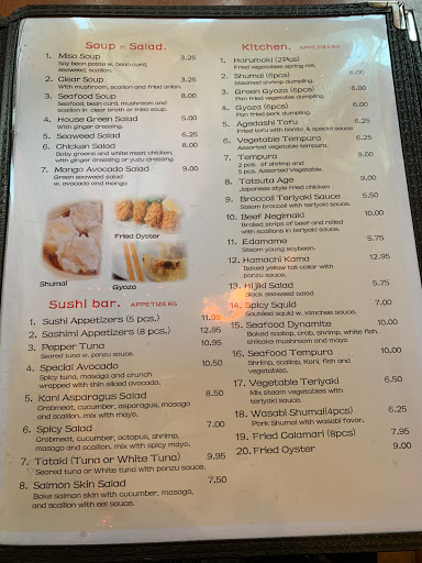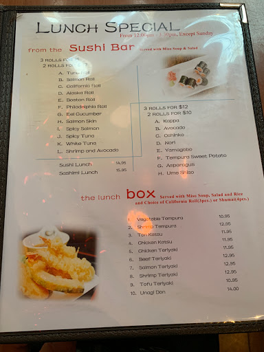 the bento boxes are more than you could ask for...which i guess is the definition of a bento box. miso soup,salad, pork katsu, cali rolls, and shumai with a side of hot green tea is my personal favorite. prices have definitely increased so i cant indulge as much as i would love to. the sushi is decent-priced. servers are always very kind. however, once i paid and left a good tip and on my way out i was followed by a female server saying my tip was not adequate. i found this very disrespectful because i even use a calculator to tip, my meal well around 30 dollars. i did not like how they handled it as well. i was brought back in and they opened the check holder so i could give the server more money when i had already calculated a generous tip. it was insulting and embarassing for me and i hope to never undergo that experience again. if it werent for the food, that experience would have turned me away from coming back ever again.
