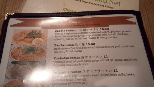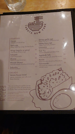 Tabata Ramen is a small, modest noodle shop that I had high hopes for given its consistently high rating on "NYC best ramen" lists on the internet. The restaurant itself has very limited decor, though this isnt really a complaint for me since I dont go to ramen restaurants for the atmosphere. The fried wings to start were delicious--incredibly crisp and flavorful on the outside and very moist and juicy on the inside. This got me excited for my bowl of Tonkotsu ramen, but that turned out to be a huge let down. Nothing about the bowl of noodles and condiments was that good. The soup did not have the intense richness that I have come to expect of tonkotsu. The pork charsiu was fine but not particularly flavorful. The scallions were a little bit overpowering. Overall, I was just left wanting more of my bowl of noodles. It wasnt particularly bad, but it most certainly was not particularly good. Perhaps I am judging too quickly and I would not be opposed to going back to try a different type of ramen if Im in the area, but if youre really looking for a good bowl of noodle soup, try Ippudo Westside or Totto Ramen, both which are just 10 streets farther north (though unfortunately probably a 1-2 hour wait).