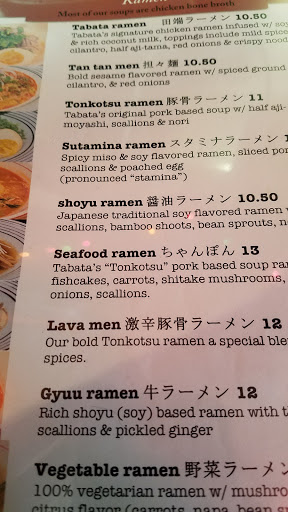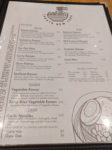 One of my favorite ramen places in the city. As I work around this area, Im often stumped as to what food options are available to me that will not be infested with many tourists. Unfortunately, this usually means anything east of 8th Avenue is out of the picture. Luckily, right near the back entrance of Port Authority lies Tabata. This is the second of the Tabata restaurants, the first merely an avenue away on 8th Avenue. The lunch there is cheap, under 15 dollars for a giant bowl of ramen and a side salad. My recommendations would be either the Tonkatsu Ramen, the Lava Men (which is just a spicy version of the Tonkatsu), or the Shoyu Ramen. Those are my personal favorites. The ramen is well made, the broth delicious, and the noodles are cooked to the texture I like. I would say comparable to the more well known ramen places (such as Totto Ramen), but without the long wait and the steeper prices.