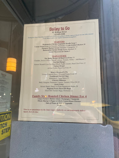 Love The Bailey! Its around the corner from my office, so Im there VERY often! Love the decor. And the food.. where do I start?! The Burrata appy is probably the best burrata appy Ive had in New York City, and Ive had a few! LOVE the Oak Smoked Salmon, and their Caesar Salad is fresh and clean, the way it should be, not mayonnaise soaked glob that even some of the better steak houses are serving these days. The wine and craft beer selection is terrific. Great for lunch and a great vibe for happy hour.