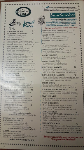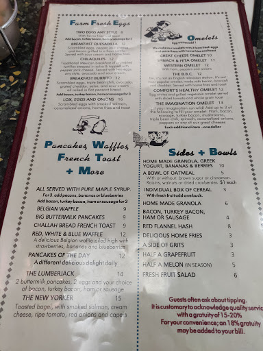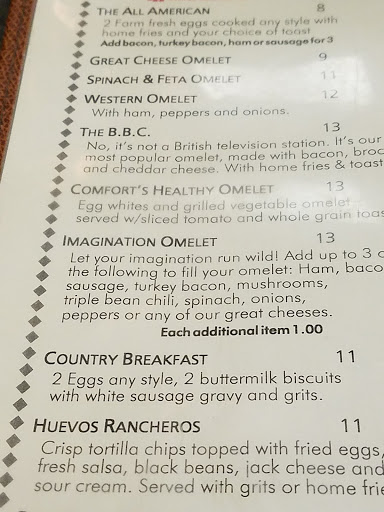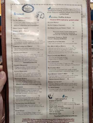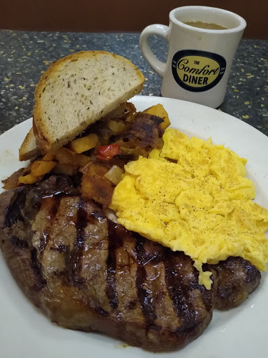 Full disclosure: I have been going to the Comfort Diner for years. I am a fan of and loyal to it based on many years of really good meals and chats with the staff. Pancakes, omelets, oatmeal, burgers, and I could go on. So it is with kindness, respect, and an intention to help (and a hope that someone who works there reads this) that I share my thoughts about my most recent experience there (4/22/17). The corned beef in the corned beef hash (which includes beets, sweet potatoes, and onions) needs to be chopped so the meat can cook consistently and provide the right texture for what hash is supposed to be. I did not eat half of what was on my plate because most of the corned beef pieces were the size of matchbooks. Not only is that a bad texture for corned beef, it makes the dish more like a stew without the sauce than like a hash. Lastly, when a diner asks for eggs poached medium, that does not mean white cooked and yolks raw. Needless to say, I will order differently on my next breakfast/brunch run. Other than that, the Comfort Diner is one of two diners I go to in the area because quality food and service are worth spending more money.