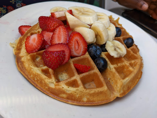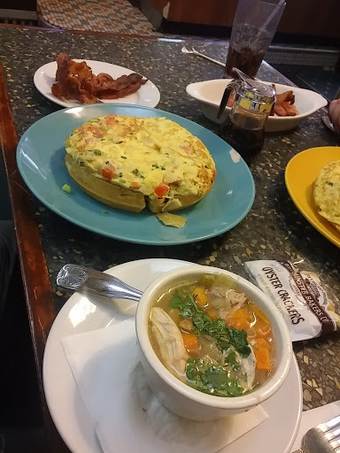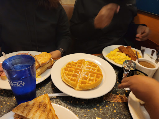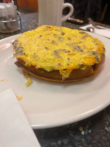 Been going here everyday before work for the past few days as its really convenient. Food comes out quick and man Ive never had such a good waffle or stack of pancakes. Not sure what they put in that batter but man is it good. Not the best decor but honestly Im not sure why that should affect a rating on a diner, it still looks fine to me. Ask for a blueberry muffin too, it aint on the menu but its right on the end of the counter and they are really good. Cant say anything about the coffee because I usually get an iced coffee beforehand at Starbucks that I like, but the guy next to me whos there everyday always gets a cup of it so I cant imagine its that bad. Good, solid, place. Only bad experience I had was the omelette was a little huge for my taste, 3 eggs with a ton of cheese and filling. But it still tasted good.