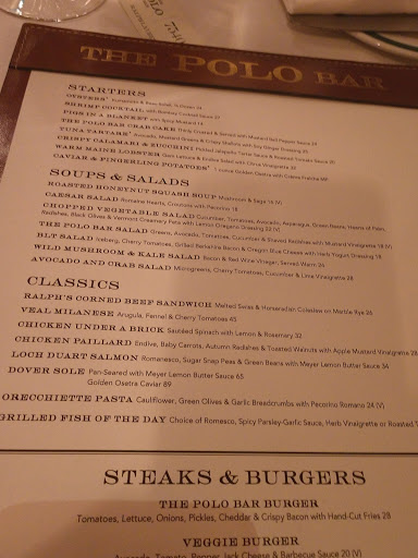 Twas the night before Christmas, with NYC aglow, Warmhearted friends dined at Polo. Celebrating Christmas Eve at the Polo Bar this year was a special experience and one that that we highly recommend throughout the year. By way of background, you must have a reservation – suggest you call at least three weeks in advance of the date. You will be greeted by a host when you arrive and your reservation will be confirmed.…. Arrive a bit early so you can enjoy time at the bar before dinner. The ambiance is wonderful and the mixologists are both expert and sociable. The dining room is located on a lower level. Our table was available at the scheduled time. The folks around us were friendly and nice. The food was delicious. My son thoroughly enjoyed his filet mignon. My husband loved his veal chop. I enjoyed my burger. We recommend the shrimp cocktail, pigs in blanket and baked clams appetizers. Unfortunately, the waiter accidently spilled drinks at our table. My pocketbook and jacket were hit as well as other friends clothing. The waiter froze for a bit but recovered and got club soda and napkins. We were in a festive mood and didn’t want to create a scene, so we just laughed and moved on. One post dinner thought and small suggestion. The restaurants “accidental spill policy” should be reviewed by Management. A standing policy that provides a small discount or complimentary item would go a long way towards cementing the establishment’s outstanding reputation for service. Polo Bar is a wonderful place to have a celebration. Clubby and nice but not stuffy! In sum, our family will return many times in the future… I’m confident your family will equally enjoy the experience.