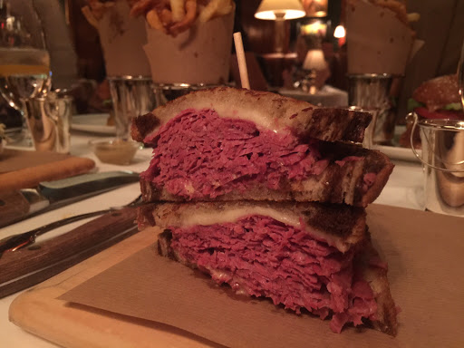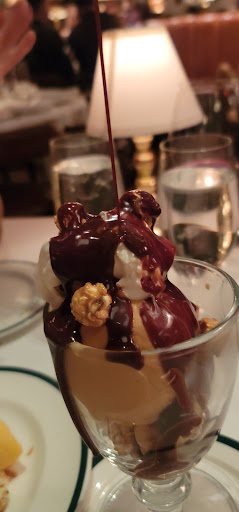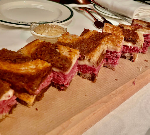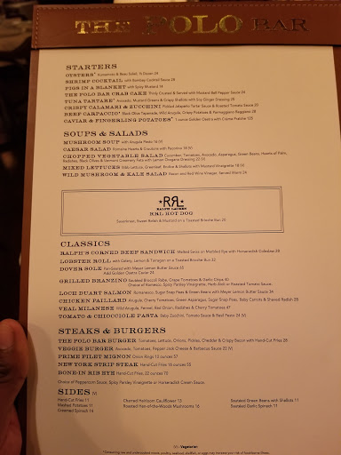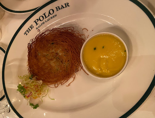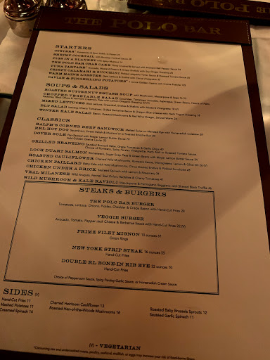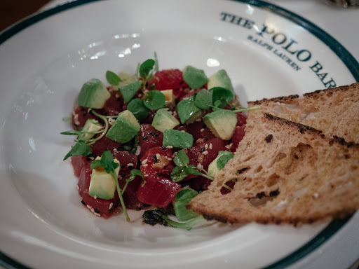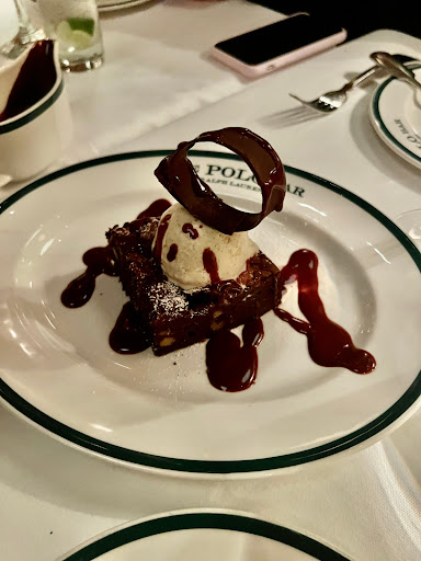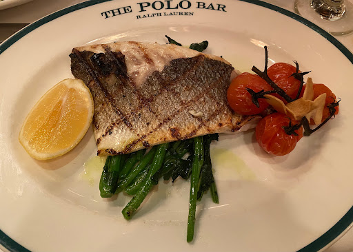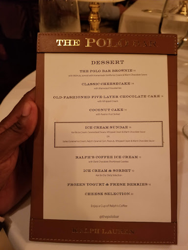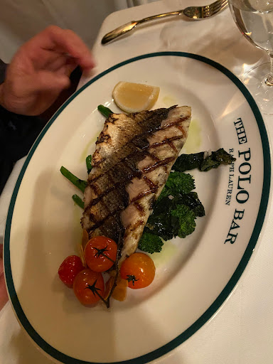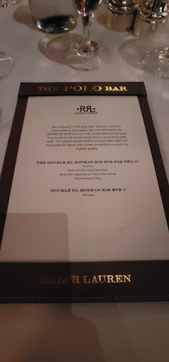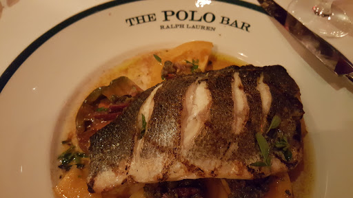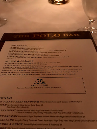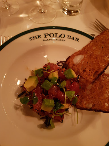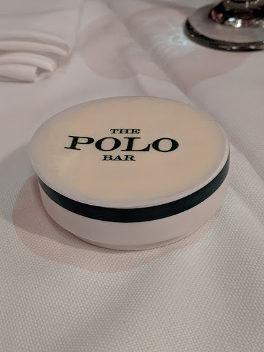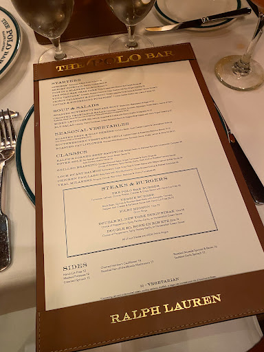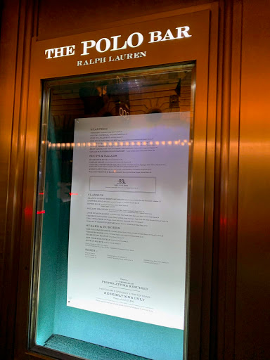 I wanted to check out The Polo Bar when it first opened up. Who wouldnt want to dine in this tribute hall to all things preppy and elegant? Ok, maybe that sort of thing is not for everyone. But I aspire to such heights. While I may not currently live in a multi-million dollar town house or wear a custom tailored suit every day, and collect vintage cars, and sail to Nantucket during the summer, I can certainly indulge in the occasional fine dining experience. And thats what The Polo Bar is. Is the food perfect? No. But everything else is, and that makes the food and the experience that much better. The hard part about eating here is the wait. You need to call one month in advance to reserve your spot. On my way in the door, I was greeted by a man and woman working the door, and dressed similarly in camel-colored overcoats. The gent checked my reservation and let me in. I entered into the bar area which is small, but has a fair amount of small cocktail tables. I met my guest (my dad) and we were escorted down the stairs to the dining room where we were promptly greeted by a man in charcoal trousers, a navy blazer (with brass buttons), shirt, and tie. Another similarly dressed gent took our coats. I was starting to notice a theme here. We were seated next to a foursome of young (20s) attractive (3/4) students (?) - my dad taking the inside seat on a tufted leather seat, and I on the outside in a standard restaurant chair. The tables are covered in white tablecloths. The dishes are all white with blue trim sporting the Polo Bar logo. We took our time once given the food and drink menus. I ordered a Vesper martini. My dad got a vodka gimlet. They mix a good drink. They brought complementary popovers and soft butter. The service and presentation impeccable. I should also all waiters and waitresses were dressed alike in charcoal trousers, white oxford shirts, repp strip ties, and medium brown oxford shoes. We started with a delightful tuna tartare. For an entree, we split a 22oz bone-in rib-eye steak supposedly originating from Ralphs personal RRL ranch in Colorado. The steak came with pepper corn sauce and fries, and we added a plate of roasted brussels sprouts. Everything was wonderful. The steak was cooked to perfection. I mentioned earlier that the food is not perfect. So, the sprouts were a little on the small side. The steak had a little more fat than I prefer. They dont lose a star over this. We finished up and ordered cups of Ralphs coffee, a scoop of sorbet, and a slice of cheesecake with blueberry compote. Again, everything was delicious! I will return again, but not for at least a month...