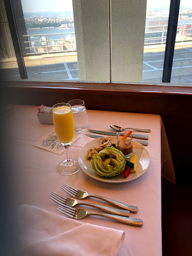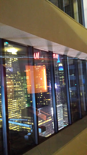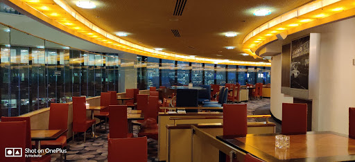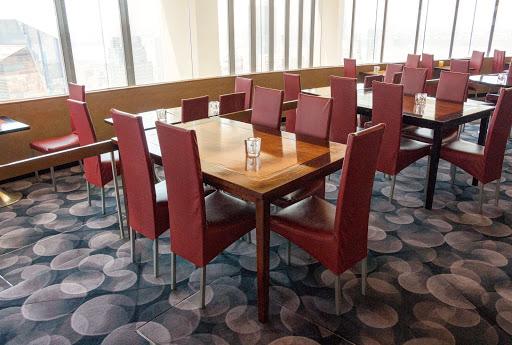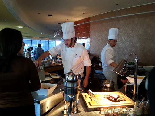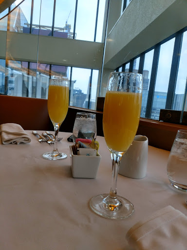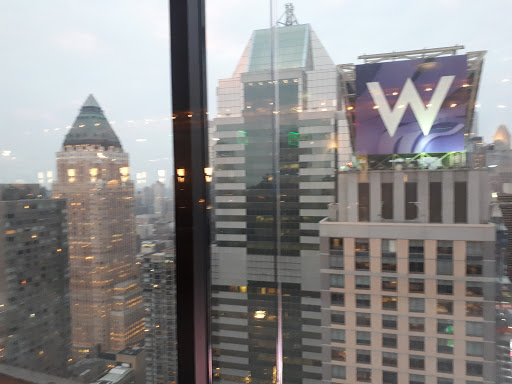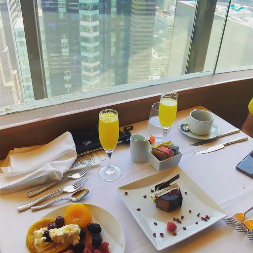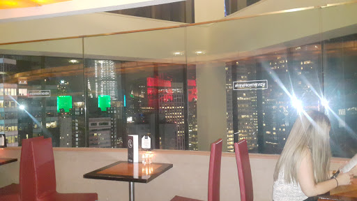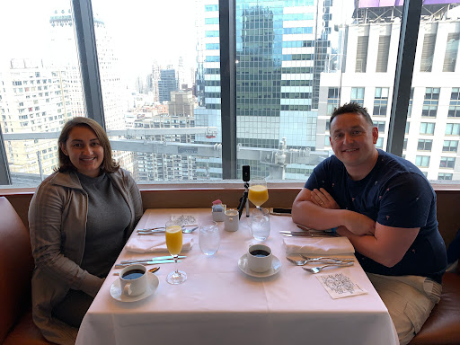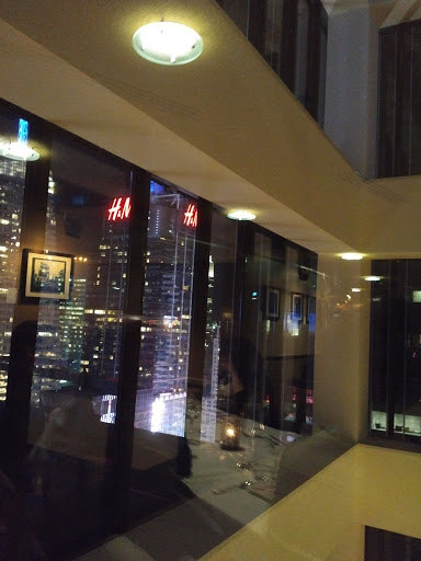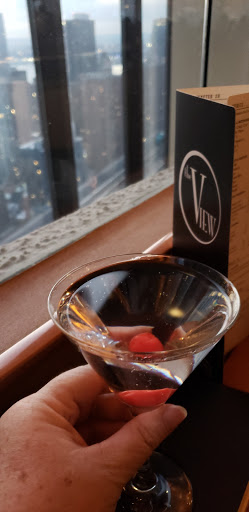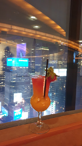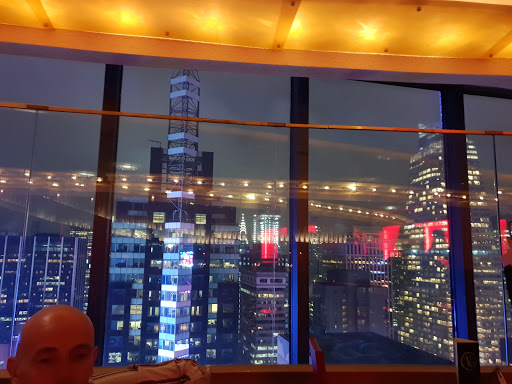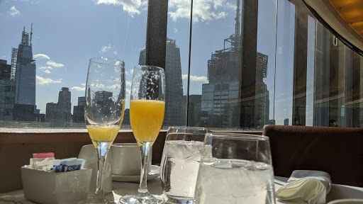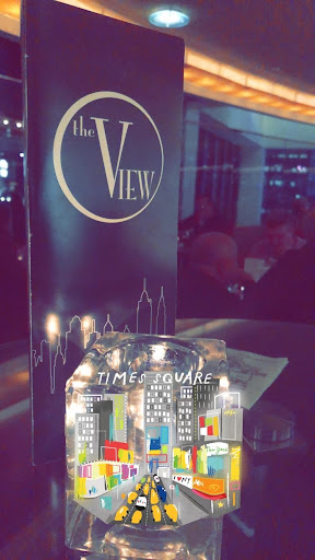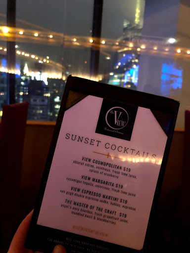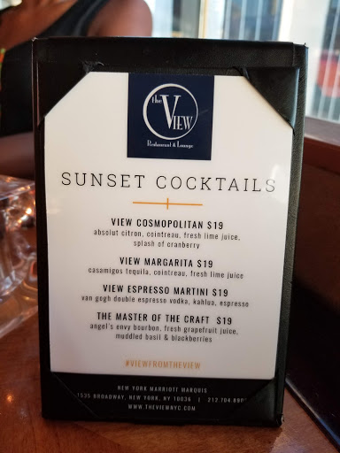 Six of us just went to The View restaurant up top of the Mariott Marquis near Times Square for my moms birthday. First the good. The hotel is very nice and rich looking. The elevators are, like they say on their site, pretty cool and sleek looking. Special elevators take you all the way up to the restaurant. The ambiance and atmosphere of the lounge and restaurant are excellent. Really looks like a rich luxurious place, which youll feel most financially when you ask for the check. Anyway, like I said, the tables and ambiance as a whole are top notch. Additionally, the view out on to New York city is great, although you cant really see on to the streets since below the restaurant the building stretches out a little bit father than the windows, completely blocking a downward view. Youre just up there looking at the sides of NYC bulidings and the new jersey side of the hudson. Its still good though. BAD: Food and price We went to the buffet lounge which is one floor up from the restaurant. When you think buffets you think aisles of trays of food. Not here. Just a short table with two main dishes (baked chicken and some sort of beef ribs or something) and a bunch of unique looking salads and like 5 toppings for the salads. Also pasta with marinara and about 5 toppings for the pasta. Food isnt that good. Most of the items there are COLD, and if they arent cold, they get cold pretty fast. Most of the desserts looked like they came out of sams club except crackers and cheese looked pretty high quality. Also chocoloate fondu was a plus. Price: The buffet is supposedly about $33 per person base. Im saying base like you go to buy a car thinking about the "BASE" price but then you end up paying 2 grand more in taxes and crazy dealer fees and interest. For six people, total was $344.Each drink is $6. Our "cover charge" (for being there till after 8) was $44. Gratuity was $48 (for 6+ people its automatic 18%) I know for such a unique experience and location that it aught to be very expensive. It was just the cover charge and drink prices that threw me off at the end. But I guess with a rotating platform dining room 48 stories in the sky, 80% of your payment is for the experience rather than the food.