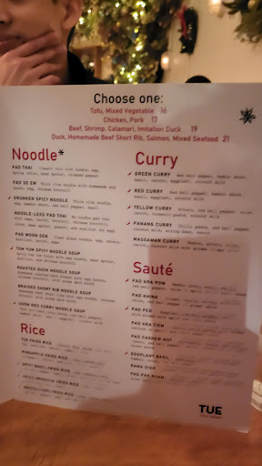 Tue has great lunch specials including noodle-less pad Thai, which is always tempting to me. It also has cheap drinks during lunch to take the edge off on those particularly stressful days.