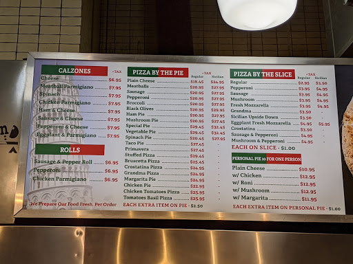 Ive been here a few times, and so far, its my favorite pizza place in the city. Im surprised by how affordable it is, too; you can get three slices for as much as lunch will cost you most other places here. The calzones are to die for, and the Sicilian slices are fantastic. The staff that works there when I eat there (during lunch hours) are amusing, cheery, and fun. Its the perfect pizza place to eat lunch if you work in the financial district.