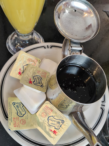 I had a total of three cups of coffee. Two were caffeinated and the third cup of coffee I informed the waiter that I wanted decaffeinated coffee because the caffeine was too strong. I had to inform two different waiters that I wanted decaffeinated coffee and after a delay one of the waiters hands reached to my coffee cup handle and pulled my coffee up and off the saucer and away to be filled I presume after making the statement that it was supposed to be left on top of the saucer and be poured into by the pot. I did not like that the waiter took the cup to a unidentified location for it to be filled and question that it could have been toilet water because of my obnoxiously loud music playing from my phone. My Android phone. The brand with the green item you would refer to as unidentifiable. Based on the taxonomy chart it is not identifiable, the item. The cafè and diner as one was great for what it was but I could not help but notice the seating area in front of me was stained and a blue hue. They must have to get that color out.
