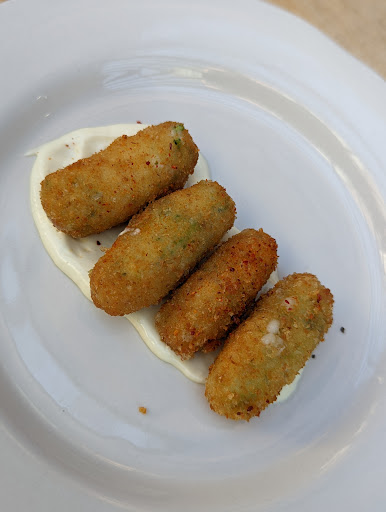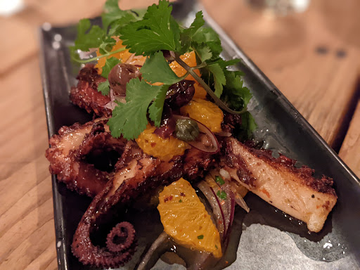I travel a lot and find myself eating alone on many nights. I always seek new and exciting places that Ive either read about or have heard about, and have bars that I can sit at. On my last several trips to San Fran I ended up in the Mission district, where there are a number of great places to choose from (Farina, Beretta, Flour+Water, Trick Dog, etc). This time I wanted to stay in the North Beach/Financial district area and ended up at Cotogna. Its a fairly lively and compact space that feels good as soon as you walk in. They have two separate "bar" areas to sit at. On the right is the actual bar and on the left is where the wood fired stove and open grill are. The only stool left when I walked in was on the left.