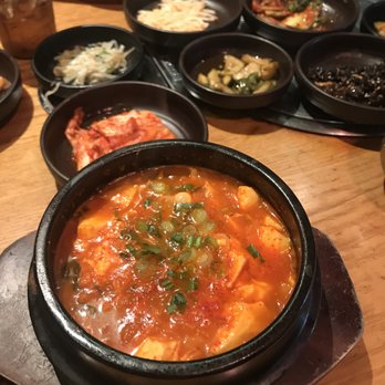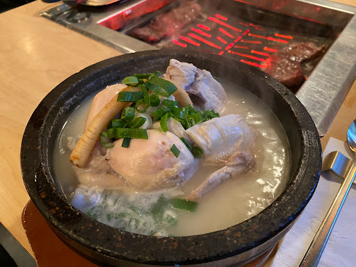 3 floors of dining and theres still a wait outside! Understandable that they wont seat you until your whole party arrives. We had a group of 5 and their confusing system of seating people had us waiting outside for awhile even after they said we were good to go and they were just finished setting up our side of the table as we sat down at the table. The other side unfortunately was shared by a large family with a crying baby. I get it real estate in NY is tight so they want to fit as many people in here as possible in this delicious smoke filled chamber of delicious meats. We ordered 2 combos for 2 people unmarinated and it comes with a variety of side dishes and stew/rice. We chose the kimchi and it was actually quite spicy for me so I just finished all the solid food and not all the veggies/broth. I have to admit the place is is quite pricey compared to the other Korean BBQ locations weve gone to. The other chains Gyu-kaku and 678 were much more affordable, but unfortunately the waits for those were probably undesirably long and not as large. The food itself was good and comparable to the other BBQ restaurants we have been to, but unfortunately it does not justify the overpriced tag per person. I would probably want to try other several other places before emptying out my wallet here.