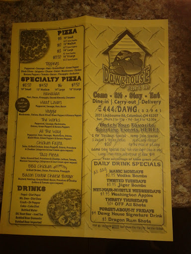 Best pizza without any question on the south end. Ive heard of Dawghouse so many times since I moved to this neighborhood just over three years ago. Finally, with guests at home for the OSU Oklahoma game I chose Dawghouse. Comments from those at my home eating away were so complimentary...we actually could have used more pizza. Im still unsure about the crust....I really thought it was a critical element to the taste that made me like it but I dont know if its a frozen purchased crust or freshly made. Ill find out. TOPPINGS TOPPINGS TOPPINGS.....FRESH, FRESH, FRESH....MAJOR QUANTITY, MAJOR QUANTITY, MAJOR QUANTITY.....They have specialty pizza choices but I find those yucky because there are those with chicken.... PRICES ARE EXTREMELY INVITING..... LOCATION, LOCATION, LOCATION....Get of your white horse if you think poorly of our neighborhood....Located on the NW corner on Lockbourne at Marion Road makes your trip so easy. Great parking lot. Safe! It is safe. CLEAN AND WELCOMING...that includes people like me and you. The three areas inside Dawghouse Id say are the pizza window, the bar with stools and then a very large dance/staged/tabled area.....its very light, breezy and large enough to move around in. STAFF ARE TOP NOTCH. ATTENTIVE, PROFESSIONAL, RESPECTFUL, SKILLED STAFF MAKE THE PLACE. DO YOU HAVE ACCESS TO 104? 104, either direction, to LOCKBOURNE ROAD NORTH, just through the first major intersection on your left. GROVE CITY HIGH SCHOOL GREYHOUNDS SUPPORTERS.....VISIT THE DAWGHOUSE....youll be glad you did. Well worth your visit....They deliver as well. Ill be taking groups there for certain....karaoke.... Dawghouse Pizza & Bar 2031 Lockbourne Rd Columbus Ohio 43207 614-444-DAWG
