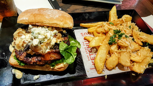 Higher-end burgers. great place nice staff very attentive. full bar. my personal favorite is the burning love burger. VERY good grilled chicken burgers. Toward the back of the menu they give you options to lower calories such as substituting a bun for leaves of lettuce, bottomless sweet potato fries or steamed broccoli etc.. if I lived closer I would be there more. YUMMM