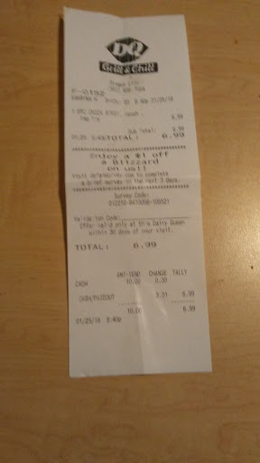 Every time I have gone for either food or blizzards they are unable to provide what was asked for. I asked for a double cheeseburger and got 2 singles, receipt said double cheeseburger, I order a blizzard with cookie dough and brownie bits it comes with no cookie dough or no brownie bits. I am always offered an apology for the inconvenience, but it sounds like lack of training and attention to detail. That being said the quality of the food is nice and the ice cream is always tasty.