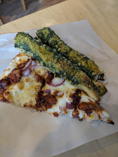Big, appetizing, tasty slices. Very conveniently located for PSU students, who get a nice discount in the afternoon. I love that everything, the plate lining, your napkins, your straw, are compostable. It feels good not having to put anything at all in the trash at the end of your meal.