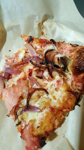 The pizza is great but I dont recommend the delivery. My delivery took an 1 and 20 minutes. The driver had problems entering my building and by the time she got to my apartment she took her bad time out on me. And, then when I opened the box it was apparent that the pizza had been dropped in a puddle. The box was totally soaked and half the toppings had slid off into the corner. I took pictures. I’m not exaggerating. Half of the pizza didn’t even have cheese on it because it had slid off the other side of the box. Oh, and the crust was wet… soaking wet. I’m pretty sure the driver was having a bad day, dropped the pizza in the rain, and just didn’t care. I’ve never had a delivery go so wrong. But, the side of the pizza that wasn’t wet and still had toppings was delicious.