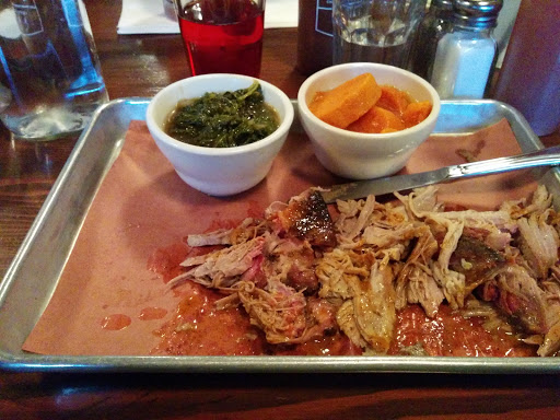 Upon arrival we were quickly greeted by a nice young woman and seated right away. I like that we were offered booth or table and not forced into whatever seat they felt worked best for rotation. With two young children, a booth is always best but seldom offered! Once seated, we had very little wait time before our server came to see what we needed. Our server had noticed me peeking at the drink menu and swiftly came over to acknowledge me and ask if I had any questions. I asked his opinion on a few drinks I thought might fit my pallet. He was a great help in selecting my drink (Pomegranate Margarita) and it was AH-MAZING! He also answered all my little nit pickey questions in regards to the food. 5 stars service!!! We ordered the pulled pork platter with beans and fries and the Meat A Palooza with Brisket, sausage and Ribs, side of greens and house salad. My order (meat a palooza):: Brisket (lean) - TENDER and smoky with a wonderful char!!!! Loved it!!! Sausage- Meaty, a slight smoky flavor and very juicy. Not too spicy pretty mild. Spare Ribs- Meaty and flavorful. EVERYTHING tasted great smothered in the KILLER BBQ SAUCE. Sides: Salad was a WASTE. Yuck! Just a bunch of iceberg lettuce with corn chips. Greens: HOLY CRAPOLA! SOOOO GOOD!!!! I think its soaked in Au jus. Omg I could die for the greens!!! The Brisket comes lean or marbled. If you like a thick cut of meat, go lean. If you like fatty, go marbled. Baby back ribs are BABY back ribs so YES they will be a smaller rack. Get the Spare ribs if you want more meat, they will be tougher but still oh so delicious. All in all ... Food was 5 stars, Service was 5 stars. Drinks were 5 stars (beer is VERY reasonably priced!) Ill come back again for sure!!!!!!!
