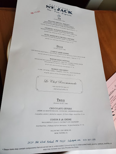 I signed up for the Bastille Day special chefs dinner. Unfortunately there was nothing special about it except the mediocrity. A wine pairing was not available. The appetizer was OK, small jars of pate, cream cheese and some olives and garlic in oil with bread. The main entree was the big disappointment, a half of roasted chicken that was barely done, still bloody in the leg joint. It was accompanied by some sour potatoes and zucchini cole slaw. It was served without a clean dinner plate on the appetizer plate. Your were expected to butcher and serve the bird yourself. Nothing French about it. No sophistication. The dessert was a cup of mousse. My second glass of wine arrived after the dinner was completed. I cannot fathom how St. Jack was recently rated #1 in Portland. This was one of the worst celebrations of French independence that I have experienced. It was a dishonor to a noble people whose cuisine is renown. There are many other restaurants in Portland that would have been my first choice. Vive la France.