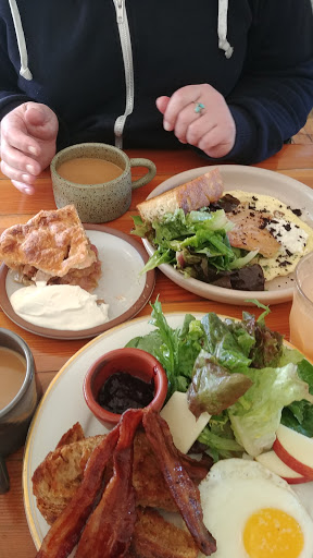 I stopped by on a Friday morning and the restaurant was full of people. I ordered a slice of pie and a pot of tea. I was told that Id have to stand with my pie until I ordered something from the kitchen and could be seated. I saw an unoccupied place at a counter seat and requested to sit and "eat my pie quickly". I was begrudgingly accommodated. The pie crust was burned on the bottom and dry. The filling was good. Im disappointed with my experience and decided to go elsewhere for the rest of my brunch.