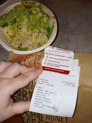 Ive never been to a Chipotle Mexican Grill before. I was a little confused as to how I was supposed to order so I asked a few questions. The woman behind the sneeze guard was no help. I ended up pointing out what I thought may be included in my meal, then paid too much for a mediocre Mexican dish that is a thousand times better at any local Taqueria. PS, who serves Mexican food without serving limes?