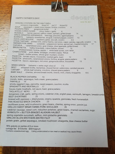 The Good: very flavorful, creative food served in an energetic atmosphere. I had bruschetta three ways, their bistro filet mignon, and one of the best panna cottas in my life. The Bad: hours feel constricted, especially on the late side, especially if you want the dining room. And when I asked for the lounge, I got grilled on whether I was expecting company -- the implication being that if I was we, "we" wouldnt be allowed to hog their precious bar seats. Ive literally never had staff ask me that before in this context, and I dont fancy a repeat. The Ugly: parking is *worse* than non-existent. They have signs on the restaurant itself warning of tow-aways from nearby stores parking, and Ive had real people confirm that for-profit towing companies prowl the area. Beaverton isnt helping with its woeful lack of parking garages, but Decarli isnt blameless as it devotes zero parking space resources of its own. The Verdict: I had great meal with expert bartending, and I want more, but I will never see this place as the same "drive up and feel pampered and at-home" experience as the abruptly-defunct Hall Street Grill. You, reading this review, should try Decarli for yourself and see.