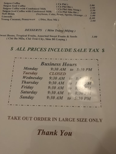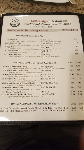 pros = This is a great little restaurant that is located off of Paxton Street, next to Jumbo Buffet. It used to be an old beer warehouse a long long time ago. the food is excellent. and i like it very spicy. Little Saigon has a basic menu, they just recently expanded it to about 25 different items. so if you dont know what to get they only have a few things to choose from. it has a main lunch hall, and also a dining area that they just recently opened up that looks a lot nicer than the rest of the place. There are TVs mounted on the walls or at either end of the dining hall that have sports or vietnamese langauge programing on. there and people are always chatting and gossiping about something. reminds me of what it would be like to actually be in Saigon. this actually is the oldest operating vietnamese restaurant in harrisburg city. and seriously.... since they opened that HACC campus up by Garden, garden raised their prices on everything by about 35% thats crazy, rose also has raised her prices... garden has a basic menu, but still is in the 4.95 - 5.25 range for most of their soups. there have been about a doszen that have come and gone, especially in the paxton street area: pho pasteur, pho vietnam, pho van houc, the pho inside Remys XO club, hung xue, saigon delite, etc.... cons = This store is the only vietnamese restaurant that sells egg rolls individually, normally they come in a pair. The last time i wet there they gave me two pairs of spring rolls, when all i wanted was one pair. I never really have been upset with people who move to this country, of the fact that they cant always speak english perfectly, I think I admire they because they are bold, they move to a new country and totally change their way of life. But it sometimes is a hassle when you say something and they dont fully grasp what you are trying to say. Also they dont take debit or credit cards, cash only. once i forgot my cash and they made me go to the store and charge my card in the store and give the cash to the waiter. I think this would have 5 stars except for the fact that the menu is so limited.