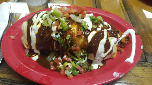 Authentic Mexican with reasonable prices. Chips and guacamole are not free, but they have complimentary margaritas. Picture is a burrito with mole sauce.
