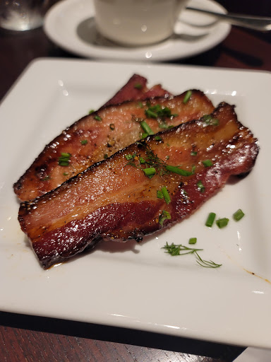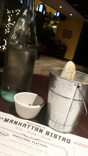 Ive never left a google review before, but I felt that the brunch experience my wife and I had at Le Manhattan Bistro this morning was so special and so wonderful, that we wanted to go out of our way to share our experience with others. First, the building is an old converted bank which has been carefully restored and tastefully repurposed as a restaurant. The space has towering ceilings, ornate wood trim and enormous arched windows - the sum of which is a grand dining atmosphere. A large vault at the far end of the hall has been retrofitted into a wine cellar and, left open, makes for a fun vignette (and as your eyes travel about the room to take it all in, they continually return to rest on the vault as a focal point). And then classic french bistro furnishings make the actual table experience feel cozy and familiar. If you make a left at the end of the main dining space, you will enter the bar area. Here the stamped-tin ceiling sits lower, which, along with the warmer lighting and fewer windows, makes this the more intimate seating area. The menu was extensive and offered both quintessential french cuisine as well as more whimsical and imaginative interpretations of classic french dishes. There were so many tempting options that it pained us to pick just one (and we cannot wait to return many times to try each of them). I had the salmon eggs benedict and my wife chose the special of the day: an asparagus crepe with gruyere cheese. Both were delicious and served promptly. My eggs were perfect and tasted farm-fresh, as did the salmon. And normally, I am scared of ordering anything with hollandaise - its such a gamble. But this was JUST right: sophisticated without being too heavy or too rich. The coffee is worth mentioning, as it was the best coffee we had in Wilkes-barre (and we tried several different places). For dessert, Jean-Baptiste (the owner?) ordered the creme brûlée for us. And even though we were feeling quite full after our entrées, we couldnt help polishing off the entire platter. It was in the top 3 creme brûlée Ive ever had (the best outside of Paris). We declined when Jean-Baptiste repeatedly urged us to try their bloody-marys because it was still early and we never really developed a taste for breakfast drinks. And after a while he stopped mentioning it... but then suddenly two shots of bloody-mary appeared on our table (replete with tiny sprigs of celery in each shot glass). I have to admit - I normally dont care for bloody marys at all, BUT THESE WERE SO GOOD. ...These leads me to the best thing about Le Manhattan Bistro: the people. Everyone we met from the service staff was exceedingly attentive and pleasant. And I sincerely hope, whoever you are, that someday you will get to meet Jean-Baptiste. His warmth, wit, charm and generosity have made Le Manhattan Bistro a very special place. Wilkes-Barre is very lucky to have Le Manhattan Bistro. Something this wonderful is usually reserved for only the most major cities. Its almost an anomaly - a big fish in a little pond. One last thing: they show french movies on Monday nights. Dinner and a movie for $20/plate. I desperately wished we could have stayed one more night to have done this.... next time, I suppose. Its a 2 hour drive from our home in Philadelphia - but we look forward to making the trip again soon.