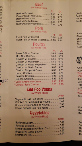 This place was very good. I get nervous trying new Chinese/Thai places, but this place was definitely worth it. Im fairly new to the area, so Im glad I found this place. We had the sesame chicken w/ pork fried rice, chicken lo mein, fried dumplings, all of which were delicious. One thing we loved about the rice was that it had fresh chuncks of white pork in it, unlike a lot of fried rice. The chicken was fresh, white meat. Id recommend you to try it out!