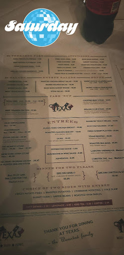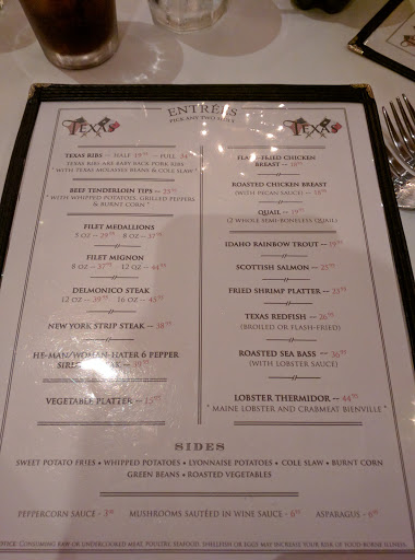 I had a blast at Texas! Food was decent and wait staff were so nice and fun. The owner even recognized us from our last visit a month ago. They have martini w olives stuffed w blue cheese, which is hard to find. Steak tips and Delmonico was really delicious. Oh the baguette is baked perfectly. This isnt the best steak I had, but it was great for the price and it was a fun filled night out. I would definitely return when in Dallas.